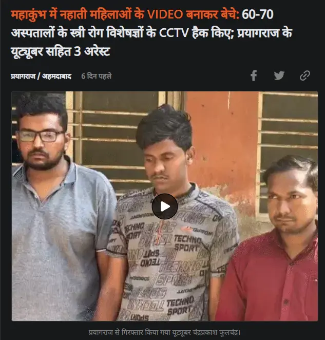 दरअसल, गुजरात पुलिस राजकोट स्थित एक अस्पताल में महिलाओं के चेकअप के वीडियो यूट्यूब पर अपलोड किए जाने के मामले की जांच कर रही थी। इसी सिलसिले में उसने महाराष्ट्र के लातूर से प्रज्वल अशोक तेली और सांगली से प्रज राजेंद्र पाटिल को गिरफ्तार किया है। वहीं इन्ही से पूछताछ के बाद प्रयागराज के यूट्यूबर चंद्रप्रकाश फूलचंद को गिरफ्तार किया गया है। चंद्रप्रकाश के चैनल पर महाकुंभ के 55 से 60 वीडियो अपलोड किए गए थे।