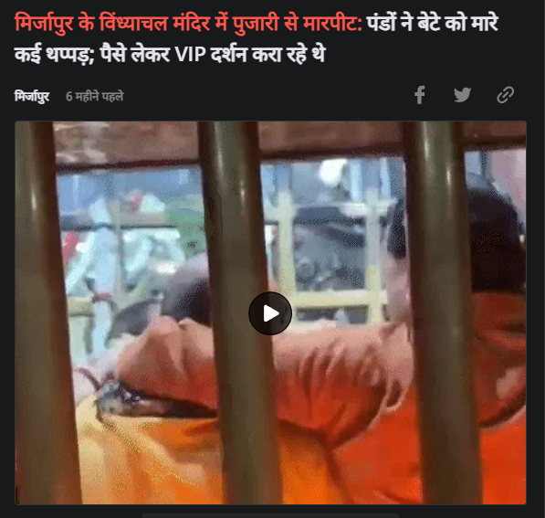 पड़ताल में आगे मिली जानकारी की मदद से गूगल सर्च करने पर हमें 5 जुलाई 2025 को प्रकाशित दैनिक भास्कर की एक रिपोर्ट मिली। रिपोर्ट के मुताबिक, यह घटना मिर्जापुर में मां विंध्याचल मंदिर की है। जहाँ मंदिर के गर्भगृह में आधी रात तीर्थ पुरोहितों के बीच मारपीट हो गई। दरअसल, श्रद्धालुओं को VIP दर्शन कराने के नाम पर पैसे लेकर मंदिर में जबरन प्रवेश कराया जा रहा था। मंदिर के पुजारी और उनके बेटे ने आपत्ति जताई। इस पर मंदिर के पंडा समाज के तीर्थ पुरोहितों ने उनको गर्भगृह में घुसकर पीटना शुरू कर दिया।