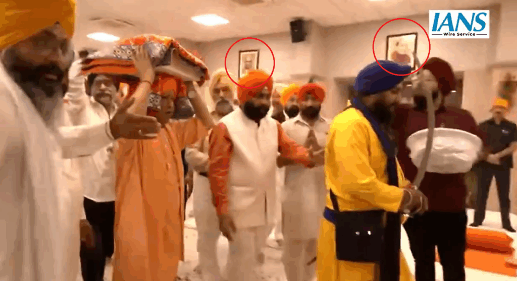 उत्तर प्रदेश के मुख्यमंत्री योगी आदित्यनाथ की एक तस्वीर सोशल मीडिया पर वायरल है। तस्वीर में मुख्यमंत्री योगी आदित्यनाथ सिख धर्म गुरु के सामने माथा टेकते हुए देखा जा सकता है। वहीं वायरल तस्वीर में पीछे दिवार पर पूर्व सीएम और सपा प्रमुख अखिलेश यादव की तस्वीर दिख रही है। दावा किया जा रहा है कि सीएम योगी गुरुद्वारा गए थे और वहां अखिलेश यादव की पहले से ही तस्वीर लगी थी।
