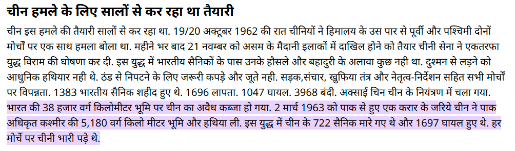 वहीं इस सम्बन्ध में टीवी9 ने अपनी रिपोर्ट में बताया है कि साल 1962 के युद्ध में अक्साई चिन चीन के नियंत्रण में चला गया। भारत की 38 हजार वर्ग किलोमीटर भूमि पर चीन का अवैध कब्जा हो गया। 2 मार्च 1963 को पाक से हुए एक करार के जरिये चीन ने पाक अधिकृत कश्मीर की 5,180 वर्ग किलो मीटर भूमि और हथिया ली। इस युद्ध में चीन के 722 सैनिक मारे गए थे और 1697 घायल हुए थे, हर मोर्चे पर चीनी भारी पड़े थे।