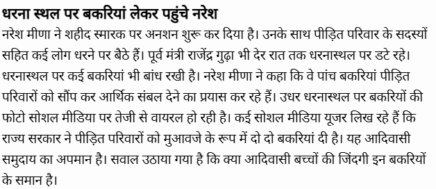 दरअसल, 25 जुलाई को झालावाड़ के पीपलोदी स्थित सरकारी स्कूल का भवन ढह गया था। इस हादसे में छह परिवारों के सात मासूम बच्चों की अकाल मौत हो गई थी और दो दर्जन बच्चे घायल हुए थे। राज्य सरकार ने पीड़ित परिवारों को 10-10 लाख रुपए की आर्थिक सहायता दी और परिवार के एक सदस्यों को संविदा पर नौकरी देने की घोषणा की थी। युवा नेता नरेश मीणा का कहना है कि इतनी कम आर्थिक मदद देकर सरकार ने संवेदनहीनता का परिचय दिया है। पीड़ित परिवारों को एक एक करोड़ रुपए की आर्थिक सहायता देने की मांग करने के साथ जिम्मेदार अधिकारियों के खिलाफ सख्त से सख्त कानूनी कार्रवाई करने की मांग की है। नरेश मीणा ने शहीद स्मारक पर अनशन शुरू कर दिया है। धरनास्थल पर कई बकरियां भी बांध रखी है। नरेश मीणा ने कहा कि वे पांच बकरियां पीड़ित परिवारों को सौंप कर आर्थिक संबल देने का प्रयास कर रहे हैं।