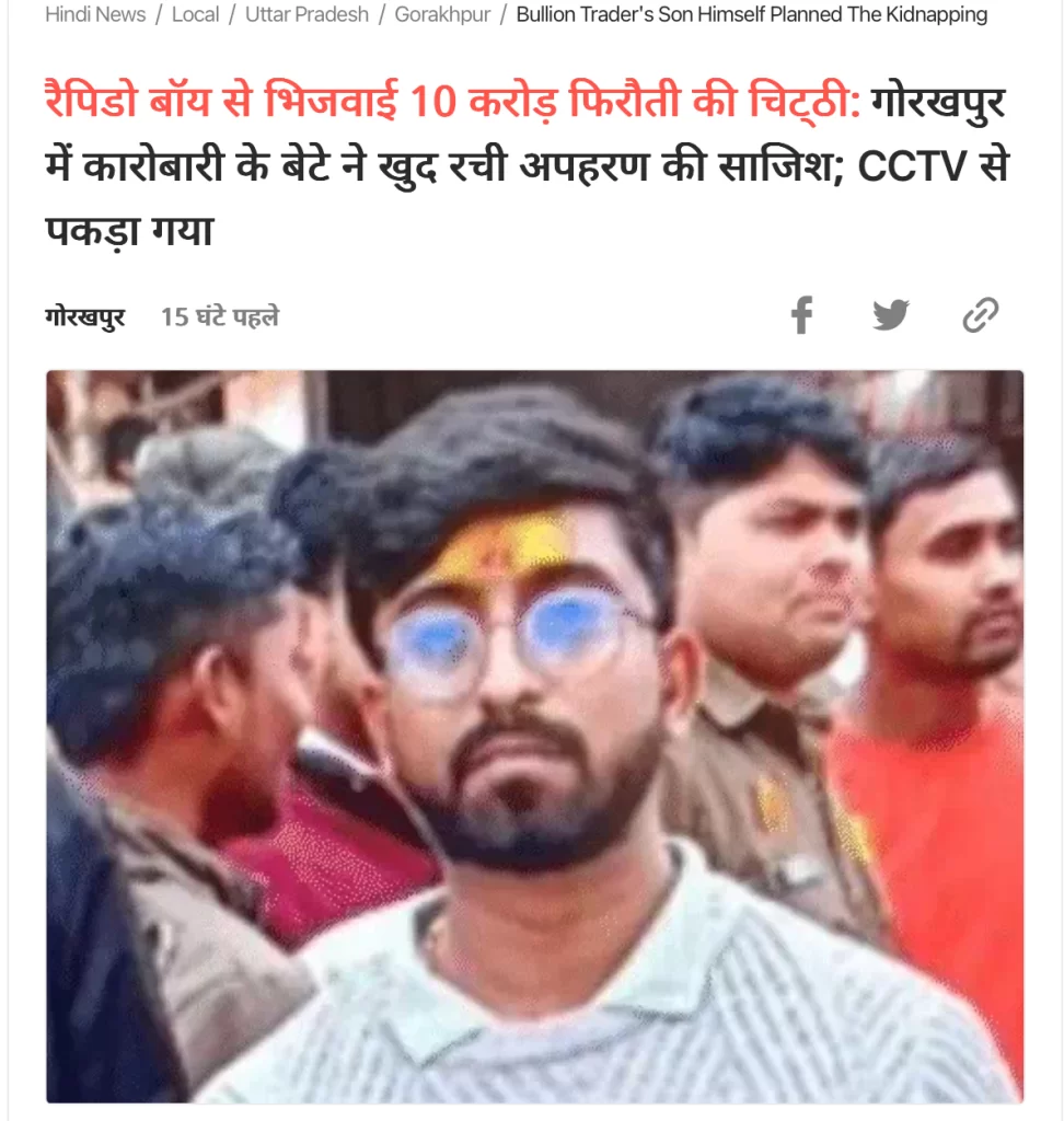 वायरल दावे की पड़ताल करने के लिए हमने मामले से संबंधित कीवर्ड्स का उपयोग करते हुए गूगल पर सर्च किया। इसके बाद हमें दैनिक भास्कर में 23 जनवरी 2025 को प्रकाशित एक रिपोर्ट मिली। रिपोर्ट के अनुसार, ‘गोरखपुर में सर्राफा व्यापारी के बेटे रोहित सावंत ने अपने अपहरण और 10 करोड़ रुपये की फिरौती की साजिश खुद रची थी। उसने रैपिडो डिलीवरी बॉय को पैसे देकर अपने घर एक चिट्ठी भिजवाई थी, जिसमें फिरौती मांगी गई थी। पुलिस की जांच में यह सारा मामला उजागर हो गया। रोहित सावंत खुद इस साजिश का मास्टरमाइंड था, और उसकी करतूतें सीसीटीवी फुटेज में कैद हो गईं। रिपोर्ट में यह भी बताया गया कि उसने कई लोगों से भारी कर्ज ले रखा था। कर्ज चुकाने से बचने और कर्जदाताओं को भ्रमित करने के लिए उसने झूठी किडनैपिंग की योजना बनाई।’