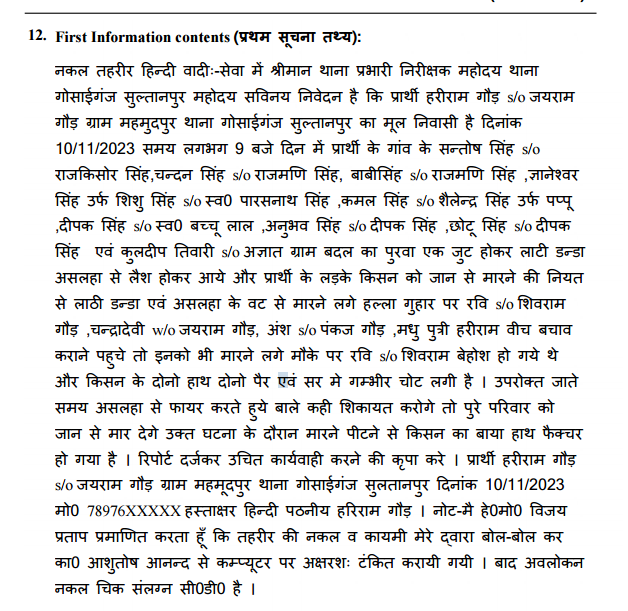 पड़ताल में इस प्रकरण को लेकर पीड़ित हरिराम गौड़ द्वारा इस मामले में दर्ज एफआईआर कॉपी मिली। एफआईआर में हरिराम ने बताया कि 10 नवंबर 2023 की सुबह संतोष सिंह, चंदन सिंह, बोबी सिंह, ज्ञानेश्वर सिंह, पारसनाथ सिंह, कमल सिंह, शैलेंद्र सिंह एवं कुलदीप तिवारी समेत कई लोगों ने मिलकर मेरे बेटे किशन पर हमला कर दिया। जब परिवार के अन्य लोग बीच बचाव करने आये तो उन्हें भी पीटा गया जिसमें शिवराम गौड़ बेशोह हो गए। वहीं किशन के हाथ, पैर और सर में गंभीर चोट आई है। इस एफआईआर में आरोपियों के खिलाफ SC/ST एक्ट नहीं लगा है।