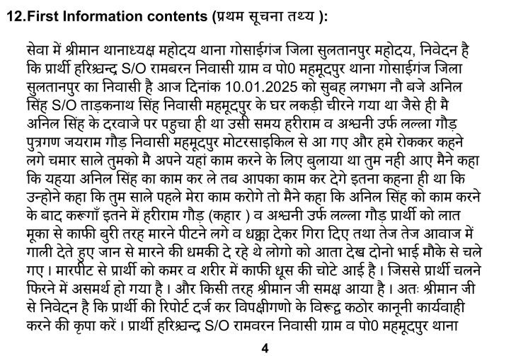 पड़ताल में हमें एक स्थानीय पत्रकार की मदद एक अन्य मामले में हरिराम गौड़ के खिलाफ दर्ज एक एफआईआर कॉपी मिली। एफआईआर में गाँव के ही हरिश्चंद्र नाम के व्यक्ति ने बताया कि 10 जनवरी 2025 को वह अनिल सिंह के यहां लकड़ी चीरने गया था। इसी दौरान वहां हरिराम और अश्विनी वहां पहुंचे और उन्होंने जातिसूचक गालियां देते हुए कहा कि मैंने तुम्हें अपने यहां काम करने को बुलाया था, लेकिन तुम नहीं आये। हरिश्चंद्र ने कहा कि पहले मैं अनिल सिंह का काम कर लूं उसके बाद आपका काम करूंगा। इतने में दोनों ने हरिश्चंद्र की पिटाई कर दी और जान से मारने की धमकी दी। इस मामले में हरिराम के खिलाफ SC/ST एक्ट में मामला दर्ज हुआ है। जाहिर है कि गौड़ पक्ष अगर एससी-एसटी वर्ग से होता तो उसके खिलाफ इन धाराओं में केस दर्ज नहीं होता।