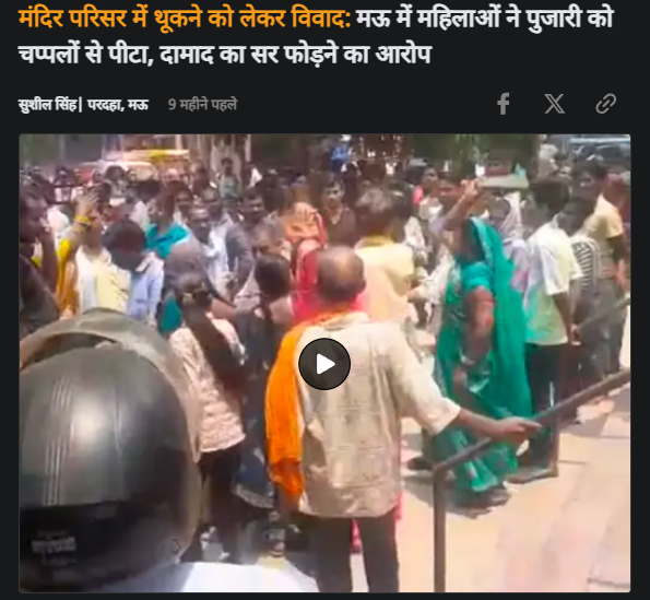 मिली जानकारी से गूगल सर्च करने पर हमें 29 अप्रैल 2025 को प्रकाशित दैनिक भास्कर की एक रिपोर्ट मिली। रिपोर्ट के मुताबिक, मऊ जिले के कोतवाली क्षेत्र में स्थित शिव मंदिर परिसर के पास थूकने को लेकर शुरू हुआ विवाद हिंसक झड़प में बदल गया। एक महिला ने पुजारी पर आरोप लगाया कि उसने उनके दामाद का सर लाठी-डंडों से फोड़ दिया। इस घटना से आक्रोशित होकर महिलाओं और स्थानीय लोगों ने पुजारी की चप्पलों से पिटाई कर दी।