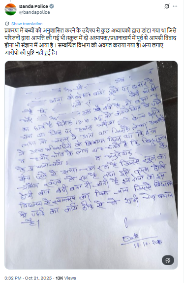 दावे की पड़ताल में संबंधित कीवर्ड्स की मदद से गूगल सर्च करने पर वायरल पोस्टकार्ड आजतक के एक्स हैंडल पर 21 अक्टूबर 2025 को पोस्ट मिला। आजतक के मुताबिक यह घटना उत्तर प्रदेश के बाँदा की है, जहां सरकारी स्कूल के प्रिंसिपल ने एक छात्र की बेहरमी से पिटाई कर दी। वजह यह थी कि छात्र ने पढ़ने के लिए क्लासरूम में प्रिंसिपल की बजाय मैडम को बुला लिया, जिससे प्रिंसिपल भड़क गए और उन्होंने स्टूडेंट को डंडे से बेरहमी से पीट दिया।