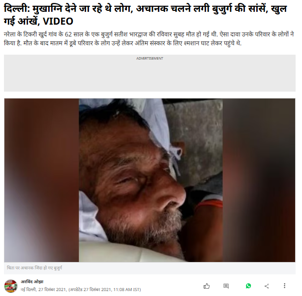 दावे की पड़ताल में वायरल वीडियो को रिवर्स सर्च करने पर हमें 27 दिसंबर 2021 को प्रकाशित आजतक की एक रिपोर्ट मिली। रिपोर्ट के मुताबिक, यह वीडियो दिल्ली के नरेला की है। वीडियो में दिख रहे बुजुर्ग नरेला के टिकरी खुर्द गांव के रहने वाले 62 वर्षीय सतीश भारद्वाज हैं। दरअसल बुजुर्ग कैंसर के मरीज थे और अस्पताल में भर्ती थें। चूंकि वेंटिलेटर का खर्च ज्यादा था तो परिजन बिना डॉक्टरी सलाह के उन्हें लेकर अस्पताल से घर पहुंच गए। वेंटिलेटर से हटाए जाने के बाद उनकी सांस बंद हो गई जिसके बाद 26 दिसंबर 2021 की सुबह करीब 11 बजे परिजनों को लगा कि उनकी मौत हो गई और वो अंतिम संस्कार के लिए लेकर उन्हें श्मशान घाट पहुंच गए।