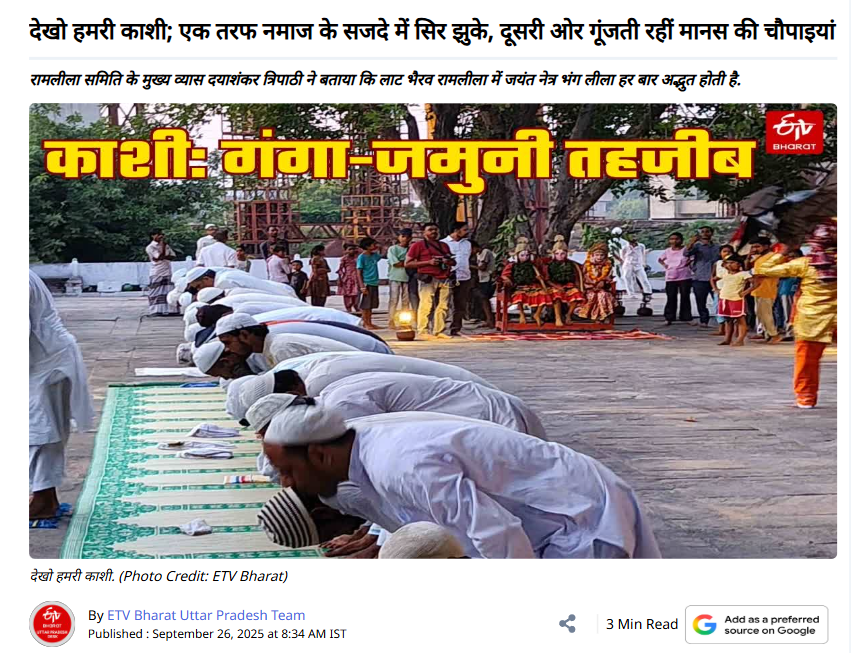 पड़ताल में हमने संबंधित कीवर्ड की मदद से गूगल सर्च किया। इस दौरान हमें 26 सितंबर 2025 को प्रकाशित ईटीवी भारत की एक रिपोर्ट मिली। रिपोर्ट के मुताबिक, यह वीडियो उत्तर प्रदेश के वाराणसी का है। जहां काशी के लाट भैरव की रामलीला में यह परंपरा निभाई जाती है। लाट भैरव मंदिर के चबूतरे पर जहां एक तरफ मुस्लिम समुदाय के लोग नमाज पढ़ते हैं, वहीं, दूसरी तरफ रामचरित मानस की चौपाइयां गूंजती हैं। यह तस्वीर तब और गहरी छाप छोड़ जाती है, जब हिंदू-मुस्लिम दोनों एकजुट होकर इस परंपरा को कायम रखते हैं।