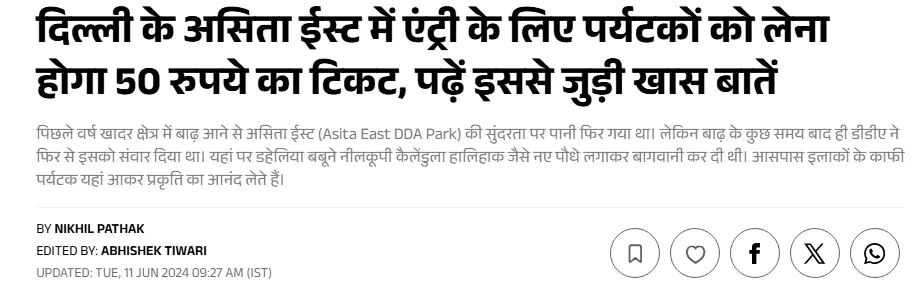 इस दावे की पड़ताल के लिए हमने संबंधित कीवर्ड्स की मदद से गूगल सर्च किया, जिसके बाद हमें दैनिक जागरण में प्रकाशित 11 जून 2024 की एक रिपोर्ट मिली। रिपोर्ट के अनुसार यमुना खादर में बने असिता ईस्ट पार्क में अब प्रवेश के लिए शुल्क देना होगा। दिल्ली विकास प्राधिकरण (DDA) ने 10 वर्ष से अधिक उम्र के पर्यटकों के लिए ₹50 का टिकट निर्धारित किया है। भुगतान नकद या UPI के माध्यम से किया जा सकता है। रिपोर्ट में यह भी बताया गया कि दिल्ली के उपराज्यपाल वी.के. सक्सेना ने 7 सितंबर 2023 को इस परियोजना का उद्घाटन किया था। असिता ईस्ट पार्क पुराने लोहे के पुल से ITO बैराज तक फैला हुआ है और इसका कुल क्षेत्रफल 197 हेक्टेयर है, जिसमें 90 हेक्टेयर क्षेत्र DDA के अंतर्गत आता है, जबकि बाकी उत्तर प्रदेश सिंचाई विभाग के पास है।
