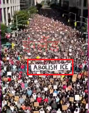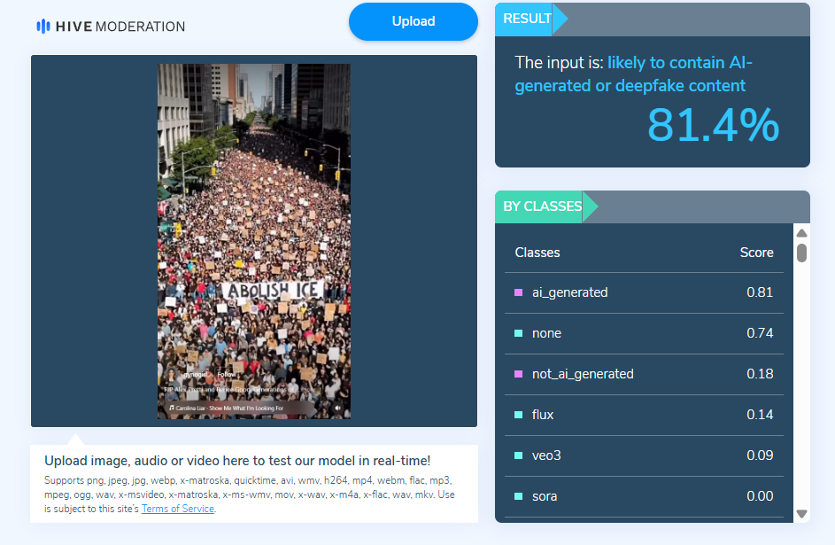 इंग्लैंड का बताकर शेयर गए तीसरे वीडियो को गौर से देखने पर इस वीडियो में हमें प्रदर्शनकारी ‘ABOLISH ICE’ का बैनर पकड़े नजर आ रहे हैं। BBC की एक रिपोर्ट के मुताबिक ‘Abolish ICE’ अमेरिका की Immigration and Customs Enforcement (ICE) एजेंसी को समाप्त करने की मांग को लेकर किया जाने वाला प्रदर्शन है। हालांकि पड़ताल के दौरान यह वीडियो भी हमें किसी आधिकारी या विश्वसनीय स्रोत पर नहीं मिला। Hive AI टूल की मदद से जांच करने पर यह वीडियो भी AI जनरेटेड पाया गया।