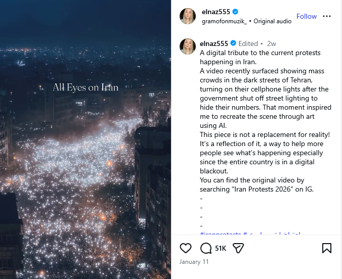 दुसरे वीडियो में सड़कों पर जमा हुए लोग मोबाइल की फ्लैशलाइट जलाये दिख रहे हैं। इसे एपस्टीन फाइल्स को लेकर अमेरिका में प्रदर्शन का बताकर शेयर किया गया है। रिवर्स सर्च करने पर यह वीडियो हमें Elnaz Mansouri नाम के इंस्टाग्राम अकाउंट पर 11 जनवरी को ईरान का बताते हुए शेयर किया गया है। वहीं इसके डिस्क्रिप्शन में इसे स्पष्ट रूप AI जनरेटेड बताया गया है। Sightengine नामक AI डिटेक्शन टूल की मदद से वीडियो की जांच की जांच करने पर भी यह वीडियो AI जनरेटेड पाया गया।