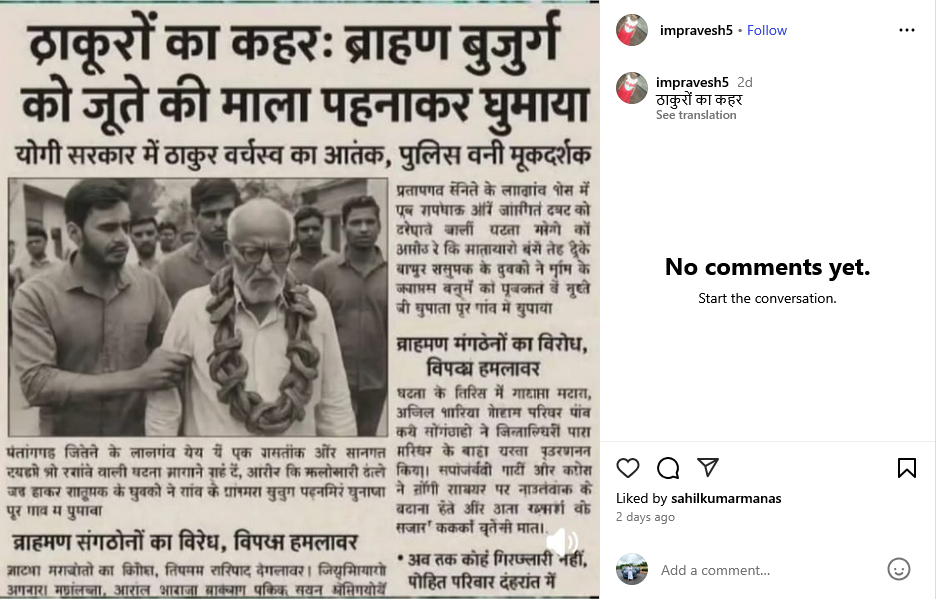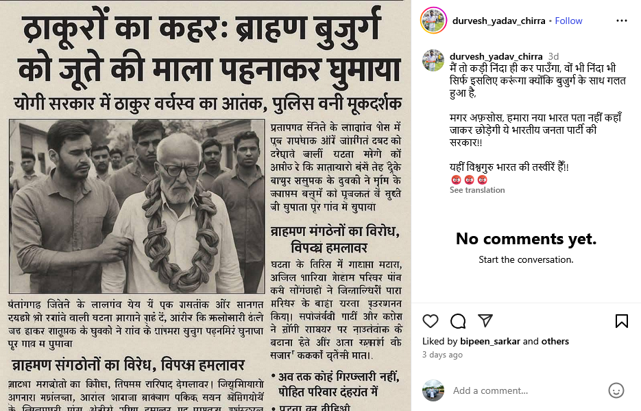 इंस्टाग्राम पर दुर्गेश यादव नाम के यूजर ने अखबार की कटिंग को पोस्ट कर लिखा, ‘मैं तो कड़ी निंदा ही कर पाउँगा, वों भी निंदा भी सिर्फ इसलिए करूंगा क्योंकि बुजुर्ग के साथ गलत हुआ है, मगर अफ़सोस, हमारा नया भारत पता नहीं कहाँ जाकर छोड़ेगी ये भारतीय जनता पार्टी की सरकार!! यहीं विश्वगुरु भारत की तस्वीरें हैँ!!’