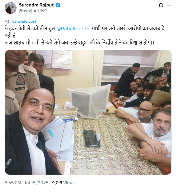 कांग्रेस नेता सुरेंद्र राजपूत ने एक्स पर लिखा, ‘ये इकलौती सेल्फी श्री राहुल @RahulGandhi गांधी पर लगे लाखो आरोपों का जवाब दे रही है। जज साहब भी तभी सेल्फी लेंगे जब उन्हें राहुल जी के निर्दोष होने का विश्वास होगा’