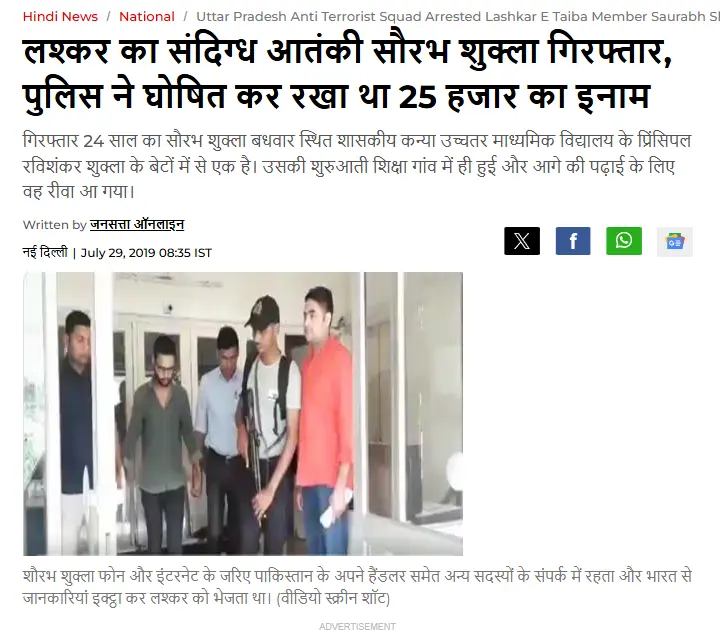 दावे की जांच के लिए हमने संबंधित कीवर्ड्स की मदद से गूगल पर सर्च किया। इस दौरान हमें 29 जुलाई 2019 को प्रकाशित जनसत्ता की एक रिपोर्ट मिली। रिपोर्ट के मुताबिक, उत्तर प्रदेश एंटी टेररिज्म स्क्वाड (एटीएस) ने पाकिस्तान के आतंकी संगठन लश्कर-ए-तैयबा के लिए काम करने के लिए रविवार (28 जुलाई, 2019) को संदिग्ध आतंकी सौरभ शुक्ला को यूपी के प्रयागराज से गिरफ्तार किया है।