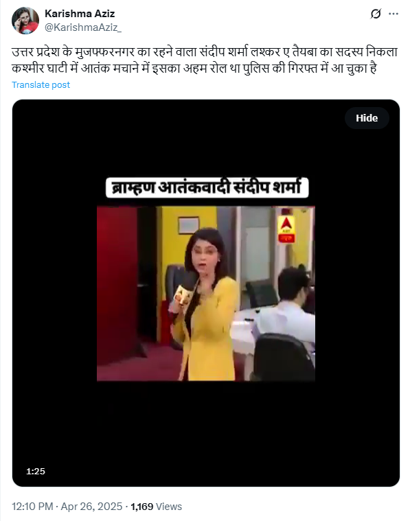 करिश्मा अजीज नाम ने एक्स पर लिखा, ‘उत्तर प्रदेश के मुजफ्फरनगर का रहने वाला संदीप शर्मा लश्कर ए तैयबा का सदस्य निकला कश्मीर घाटी में आतंक मचाने में इसका अहम रोल था पुलिस की गिरफ्त में आ चुका है’