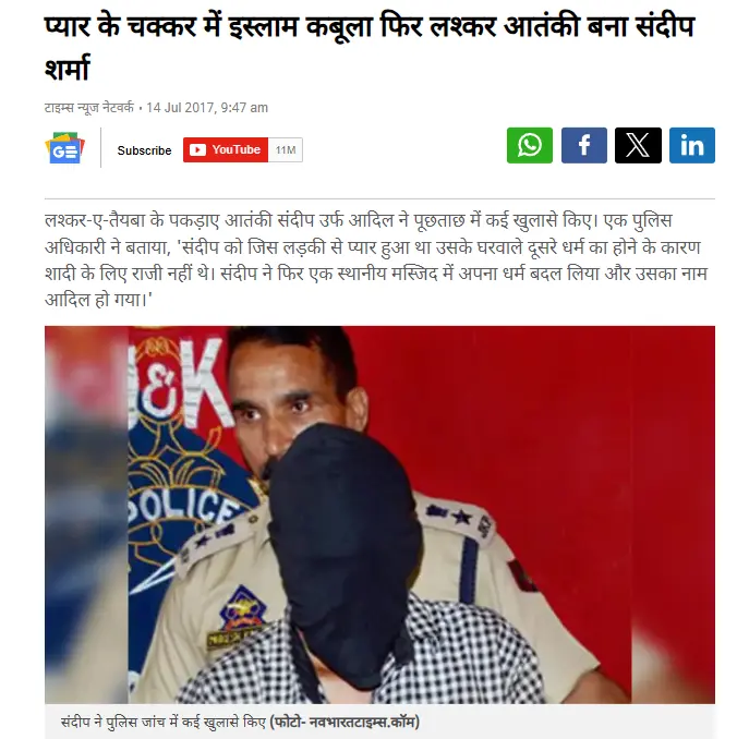 वायरल दावे की सच्चाई जानने के लिए हमने मामले से जुड़े प्रमुख कीवर्ड्स की मदद से गूगल सर्च किया। इस दौरान हमें 14 जुलाई 2017 को प्रकाशित नवभारत टाइम्स की एक रिपोर्ट मिली। रिपोर्ट के अनुसार, पुलिस ने लश्कर-ए-तैयबा के पकड़े गए आतंकी संदीप उर्फ आदिल को पकड़ा था। संदीप ने जांच-अधिकारियों को बताया कि उसे एक कश्मीरी महिला से प्यार हो गया था। प्यार की वजह से उसने आतंक और इस्लाम कबूला।