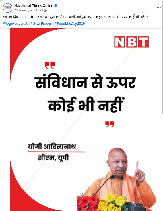 दावे की पड़ताल में संबंधित कीवर्ड्स की मदद से गूगल सर्च करने पर हमें सीएम योगी आदित्यनाथ का ऐसा कोई बयान नहीं मिला। इसके बाद हमने वायरल पोस्टकार्ड को नवभरत टाइम्स के सोशल मीडिया हैंडल्स पर खंगाला। इस दौरान वायरल पोस्टकार्ड से मिलता-जुलता एक पोस्टकार्ड हमें नवभारत के फेसबुक पेज पर 26 जनवरी 2026 को पोस्ट मिला। इस पोस्ट में गणतंत्र दिवस 2026 के अवसर पर यूपी के सीएम योगी आदित्यनाथ ने कहा, “संविधान से ऊपर कोई भी नहीं।”