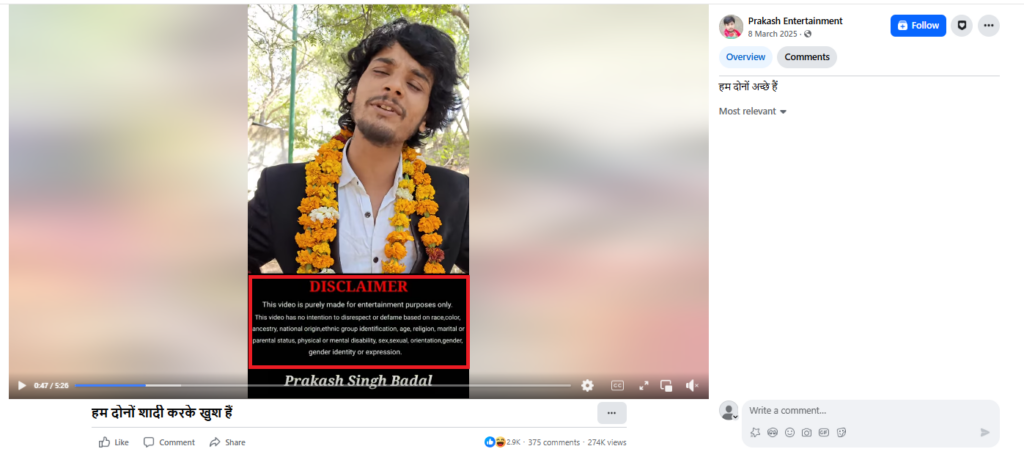 दावे की पड़ताल के लिए सबसे पहले हमने वीडियो के अलग-अलग स्क्रीनशॉट लेकर रिवर्स इमेज सर्च किया। इस दौरान यह वीडियो हमें प्रकाश एंटरटेनमेंट नाम के फेसबुक पेज पर 5 मार्च 2025 को पोस्ट मिला। वीडियो में ठीक 47 सेकेंड पर एक डिस्क्लेमर देखा जा सकता है। जिसमें स्पष्ट रूप से लिखा है कि यह वीडियो केवल मनोरंजन के उद्देश्य से बनाया गया है।