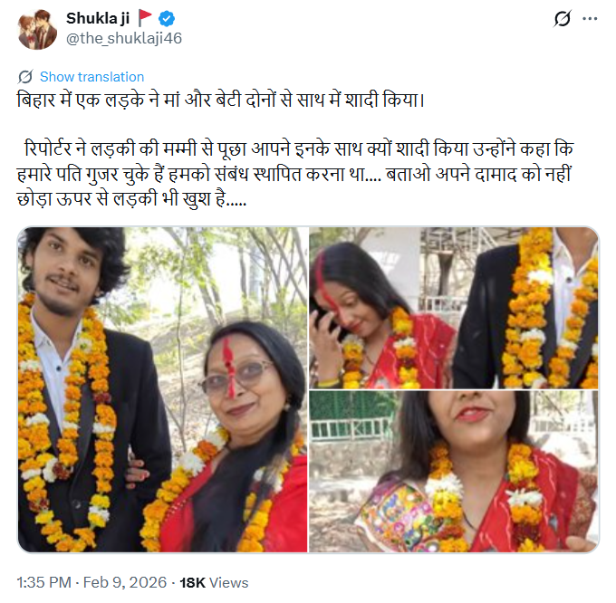 वहीं शुक्ला जी नाम के एक्स हैंडल ने लिखा, ‘बिहार में एक लड़के ने मां और बेटी दोनों से साथ में शादी किया। रिपोर्टर ने लड़की की मम्मी से पूछा आपने इनके साथ क्यों शादी किया उन्होंने कहा कि हमारे पति गुजर चुके हैं हमको संबंध स्थापित करना था…. बताओ अपने दामाद को नहीं छोड़ा ऊपर से लड़की भी खुश है’