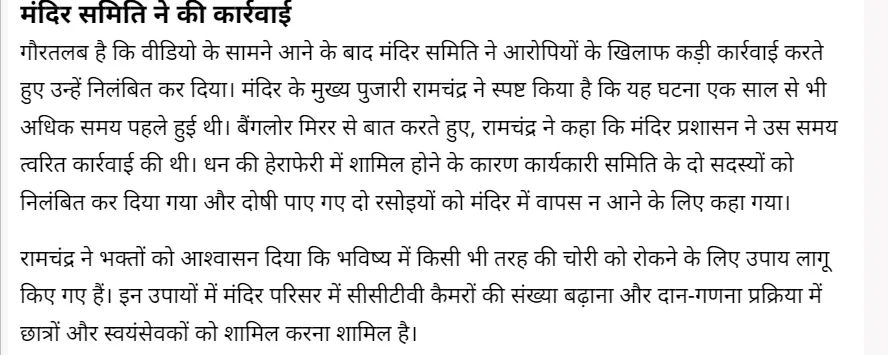 रिपोर्ट के मुताबिक मंदिर के मुख्य पुजारी रामचंद्र ने स्पष्ट किया कि यह घटना एक साल से अधिक समय पहले हुई थी। बैंगलोर मिरर से बात करते हुए, रामचंद्र ने कहा कि मंदिर प्रशासन ने उस समय त्वरित कार्रवाई की थी। धन की हेराफेरी में शामिल दो कार्यकारी समिति के सदस्यों को निलंबित कर दिया गया और दोषी पाए गए दो रसोइयों को मंदिर में वापस न आने के लिए कहा गया। रामचंद्र ने भक्तों को आश्वस्त किया कि भविष्य में ऐसी किसी भी चोरी को रोकने के लिए उपाय किए गए हैं, जिसमें मंदिर परिसर में सीसीटीवी कैमरों की संख्या बढ़ाना और दान-गणना प्रक्रिया में छात्रों और स्वयंसेवकों को शामिल करना शामिल है।
