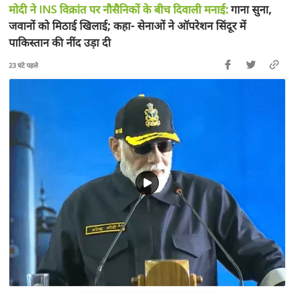 दावे की पड़ताल में संबंधित कीवर्ड की मदद से गूगल सर्च करने पर हमें दैनिक भास्कर की एक रिपोर्ट मिली। रिपोर्ट के मुताबिक, प्रधानमंत्री नरेंद्र मोदी ने सोमवार को गोवा में INS विक्रांत पर नौसैनिकों के बीच दिवाली मनाई। यहां उन्होंने करीब 40 मिनट की स्पीच दी।