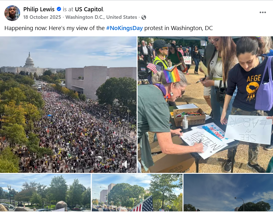 वहीं वाशिंगटन का वीडियो भी हमें 18 अक्टूबर 2025 को एक फेसबुक अकाउंट पर ‘No Kings’ प्रोटेस्ट का बताकर पोस्ट मिला।