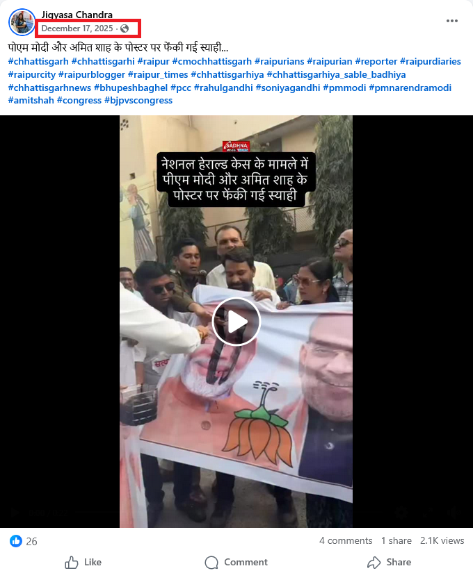 दावे की पड़ताल के लिए वायरल वीडियो के अलग-अलग स्क्रीनशॉट लेकर गूगल रिवर्स इमेज सर्च करने पर हमें यह वीडियो जिज्ञासा चंद्रा के फेसबुक पेज पर 17 दिसंबर 2025 को पोस्ट मिला। वीडियो को ‘नेशनल हेराल्ड केस के मामले में मोदी और शाह के पोस्टर पर स्याही फेंकी गई’ कैप्शन के साथ पोस्ट किया गया है।