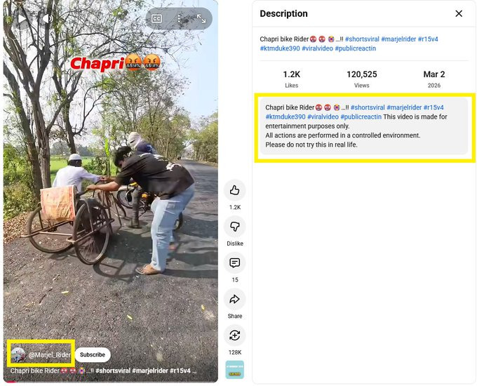 दावे की पड़ताल में हमने वायरल वीडियो के कीफ्रेम को रिवेर्स सर्च किया। इस दौरान यह वीडियो हमें ‘Marjel Rider’ नाम के यूट्यूब चैनल पर अपलोड मिला। वीडियो के डिस्क्रिप्शन में स्पष्ट रूप से लिखा है कि यह वीडियो केवल मनोरंजन के उद्देश से बनाया गया है। इस चैनल को खंगालने पर हमें इस प्रकार के कई अन्य वीडियो अपलोड मिले। जिससे स्पष्ट हुआ कि Marjel Rider एक यूट्यूबर है जो बाइक से संबंधित कंटेंट बनाते हैं।