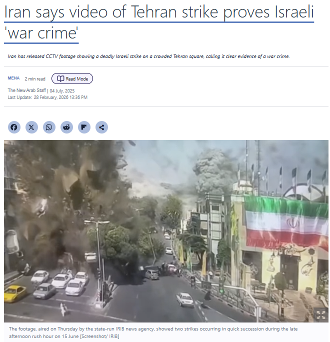 दावे की पड़ताल के लिए हमने सबसे पहले वीडियो के अलग-अलग स्क्रीनशॉट लेकर गूगल रिवर्स इमेज सर्च करने पर हमें 4 जुलाई 2025 को प्रकाशित The New Arab की एक रिपोर्ट मिली। जिसमें वायरल वीडियो के एक हिस्से को देखा जा सकता है। रिपोर्ट के मुताबिक ईरान ने एक CCTV वीडियो जारी किया है जिसमें दावा किया गया है कि यह तेहरान के तजरीश स्क्वायर (Tajrish Square) पर हुए इजरायली हमले का फुटेज है। ईरानी सरकारी मीडिया का कहना है कि यह वीडियो इजरायल द्वारा किए गए “युद्ध अपराध” (war crime) का सबूत है।