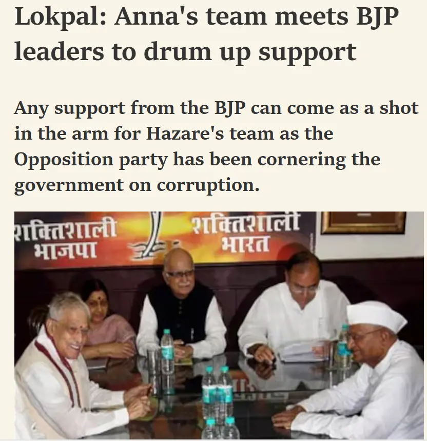 2011 में बीबीसी की रिपोर्ट के अनुसार, ‘अन्ना हज़ारे के सहयोगियों ने भारतीय जनता पार्टी के साथ बैठक के बाद कहा है कि भाजपा जन लोकपाल बिल का समर्थन करती है बैठक के बाद अन्ना हज़ारे के सहयोगि अरविंद केजरीवाल ने कहा कि भाजपा को जन लोकपाल के बारे में जो सशंय थे उन्हें लगभग दूर कर दिया गया है।’, नितिन गडकरी और अरुण जेटली ने भी अन्ना हज़ारे की टीम के साथ हुई बैठक को सकारात्मक बताया।