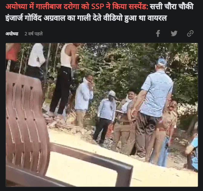 मिली जानकारी से गूगल सर्च करने पर हमें मामले से संबंधित दैनिक भास्कर की एक रिपोर्ट मिली। रिपोर्ट के मुताबिक, वीडियो वायरल होने के बाद एसएसपी करण नय्यर ने इंस्पेक्टर गोविंद अग्रवाल को सस्पेंड कर दिया था। दरअसल, रौनाही थाना क्षेत्र के गाँव गांव रग्घूपुर दोस्त में अर्जुन पांडेय व जगदम्बा शुक्ला के बीच रास्ते को लेकर विवाद चल रहा था। विवाद सुलझाने के लिए पुलिस ने दोनों पक्षों को पंचायत के लिए बुलाया था। साथ ही चौकी प्रभारी गोविंद अग्रवाल सिपाहियों के साथ मौके पर पहुंचे थे। गांव के अर्जुन पांडेय व किशोरी आंचल पांडेय का कहना है मौके पर अपनी मोटरसाइकिल से पहुंचे विपक्षी युवक चंदन शुक्ला ने तमंचा निकाल लिया और पुलिस के सामने ही जान से मार डालने की धमकी दी। माजरा देख चौकी प्रभारी तैश में आ गए और उन्होंने गाली-गलौच शुरू कर दी थी।