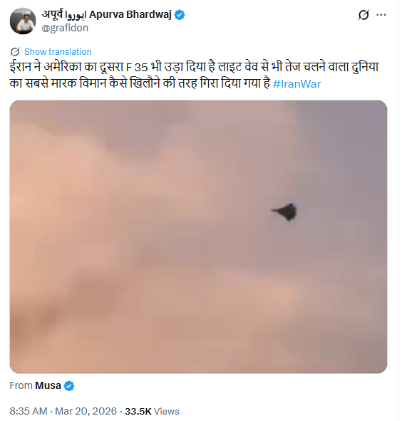 अपूर्व भारद्वाज ने लिखा, ‘ईरान ने अमेरिका का दूसरा F 35 भी उड़ा दिया है लाइट वेव से भी तेज चलने वाला दुनिया का सबसे मारक विमान कैसे खिलौने की तरह गिरा दिया गया है’