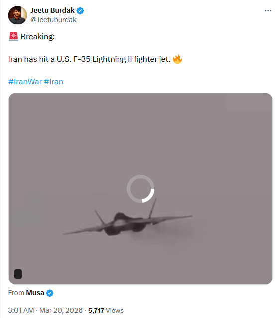 जीतू बुरडक ने एक्स पर वीडियो को शेयर कर लिखा, ‘ब्रेकिंग: ईरान ने अमेरिका के F-35 लाइटनिंग लड़ाकू विमान पर हमला किया है।’