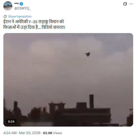 वहीं MTQ नाम के एक्स हैंडल ने लिखा, ‘ईरान ने अमेरिकी F-35 लड़ाकू विमान को फिज़ाओं में उड़ा दिया है… विडियो वायरल।’