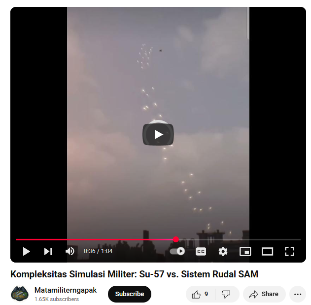 वायरल वीडियो की जांच के लिए हमने वीडियो के कीफ्रेम को रिवर्स सर्च किया। इस दौरान यह वीडियो हमें 18 मई 2025 को Matamiliterngapak नाम के यूट्यूब चैनल पर पोस्ट मिला। चैनल के मुताबिक यह एक मिलिट्री सिमुलेशन है, जो सुखोई Su-57 जेट और सतह से हवा में मार करने वाली मिसाइल (SAM) प्रणाली के बीच की लड़ाई को दर्शाता है। साथ ही चैनल के डिस्क्रिप्शन में स्पष्ट रूप से लिखा है कि यहां मौजूद सभी वीडियो केवल सूचनात्मक और मनोरंजन के उद्देश्यों से तैयार की गई है।