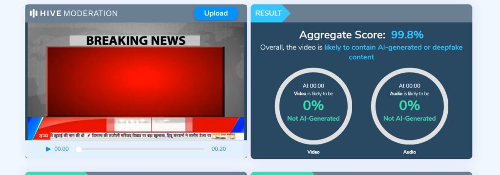 दावे की पड़ताल में संबंधित कीवर्ड्स की मदद से गूगल सर्च करने पर हमें असम इंटेलिजेंस रिपोर्ट लीक होने की कोई मीडिया रिपोर्ट नहीं मिली। पड़ताल में पहले वीडियो को गौर से देखने पर उसमें हमें किसी भी न्यूज चैनल का नाम या Logo मौजूद नहीं मिला।वीडियो में बोलते हुए एंकर के हाव-भाव भी असामान्य नजर आ रहे हैं। इस वीडियो को AI डिटेक्टर टूल की मदद से जांच करने पर यह वीडियो AI जनरेटेड निकला।