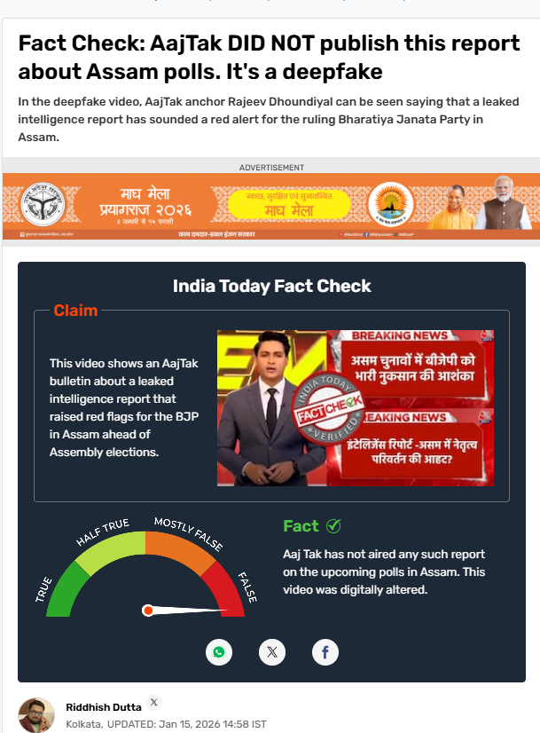 सोशल मीडिया पर दो न्यूज़ एंकरों के वीडियो वायरल है। वीडियो में दावा किया जा रहा है कि असम इंटेलिजेंस डिपार्टमेंट के अनुसार आगामी चुनावों में बीजेपी की जीत मुश्किल नजर आ रही है और सीएम हिमंत बिस्वा सरमा को हटाया जा सकता है। हालंकि हमारी पड़ताल में यह दोनों वीडियो AI जनरेटेड निकले।