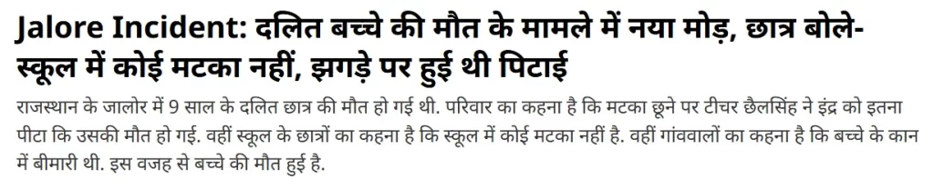 NBT ने आगे लिखा, “20 जुलाई को छात्र इंद्र कुमार मेघवाल का एक बच्चे के साथ झगड़ा हो गया था। झगड़ा एक ड्राइंग बुक को लेकर हुआ था। जब दोनों बच्चे झगड़ रहे थे, तभी शिक्षक छैल सिंह वहां पहुंचे और दोनों बच्चों को थप्पड़ मार दिया। इस पिटाई के कारण इंद्र कुमार के कान की तकलीफ बढ़ गई और घटना के 23 दिन बाद उसकी मौत हो गई। बताया जा रहा है कि इंद्र कुमार पहले से ही कान के संक्रमण (इन्फेक्शन) से ग्रसित था।”