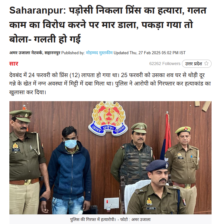 दावे की पड़ताल में हमें संबंधित कीवर्ड की मदद से गूगल सर्च किया। इस दौरान हमें 27 फरवरी 2025 को प्रकाशित अमर उजाला की एक रिपोर्ट मिली। जिसके मुताबिक, देवबंद के भायला खुर्द में हुए प्रिंस हत्याकांड का पुलिस ने खुलासा कर दिया। हत्याकांड को पड़ोसी अंकित ने अंजाम दिया, जो गलत नीयत के चलते प्रिंस को अपने साथ गन्ने के खेत में ले गया था। विरोध करने पर ईंट से वार कर उसकी हत्या कर दी।