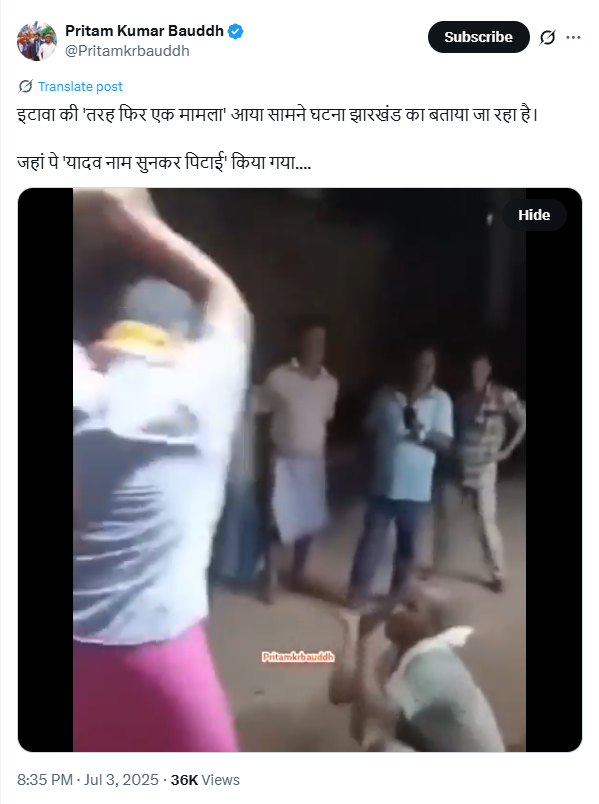 प्रीतम कुमार बुद्ध ने लिखा, ‘इटावा की ‘तरह फिर एक मामला’ आया सामने घटना झारखंड का बताया जा रहा है। जहां पे ‘यादव नाम सुनकर पिटाई’ किया गया….’