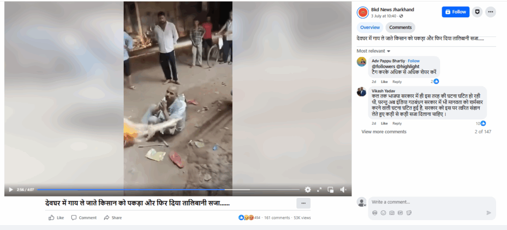 संतोष यादव सर्वोदय ने लिखा, ‘जिसको इतनी बेरहमी से पीटा जा रहा है वह व्यक्ति यादव है। ब्रह्मण व्यक्ति द्वारा इसलिए पीटा जा रहा है क्योंकि उस व्यक्ति ने अपनी गाय बेच दी। और इंसान की भेष में खड़े मुर्दे विडियो बना रहे है। मामला झारखंड के देवघर का है।’