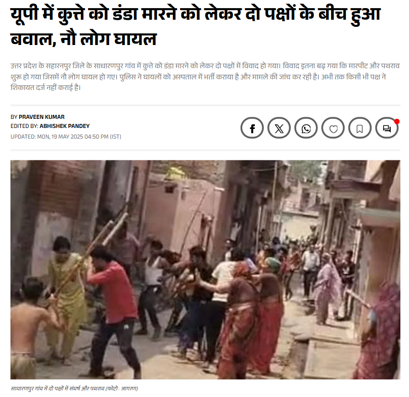 वायरल दावे की सच्चाई जानने के लिए हमने मामले से जुड़े कीवर्ड्स की मदद से गूगल सर्च किया। इस दौरान हमें 19 मई 2025 को प्रकाशित जागरण की एक रिपोर्ट मिली। रिपोर्ट के मुताबिक, उत्तर प्रदेश के सहारनपुर जिले के साधारणपुर गांव में कुत्ते को डंडा मारने को लेकर ब्राह्मण और अनुसूचित समाज के दो पक्षों में जमकर मारपीट और पथराव हुआ। 18 मई की दोपहर साधारणपुर गांव में पंडित रमेश शर्मा और अनुसूचित समाज के शालू के बीच कुत्ते को डंडा मारने को लेकर कहासुनी हो गई, जो देखते ही देखते मारपीट में बदल गई और दोनों पक्षों के लोग लाठी डंडे लेकर आमने सामने आ गए। इस दौरान ईंट पत्थर भी चले।