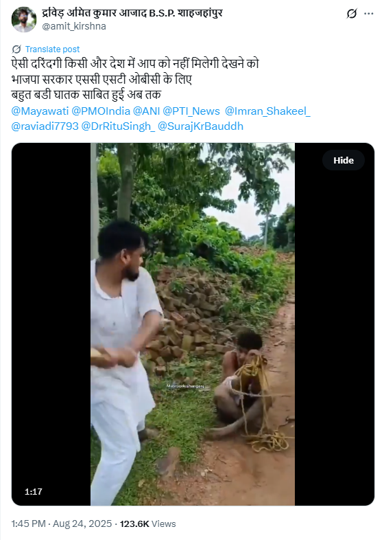 द्रविड़ अमित कुमार आजाद नाम के एक्स हैंडल ने लिखा, ‘ऐसी दरिंदगी किसी और देश में आप को नहीं मिलेगी देखने को भाजपा सरकार एससी एसटी ओबीसी के लिए बहुत बडी घातक साबित हुई अब तक’