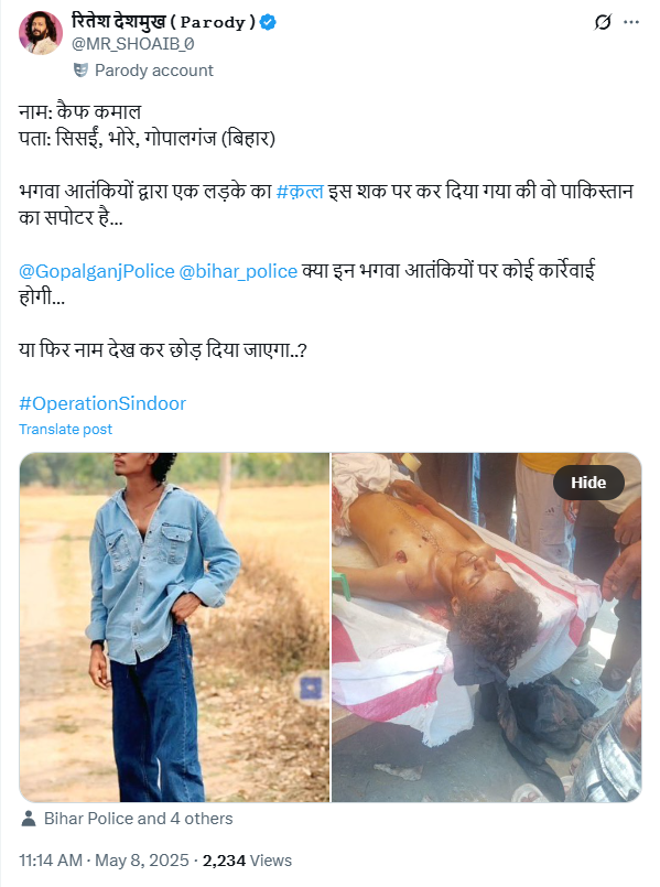 रितेश देशमुख पैरोडी नाम के एक्स हैंडल ने लिखा, ‘नाम: कैफ कमाल पता: सिसईं, भोरे, गोपालगंज (बिहार) भगवा आतंकियों द्वारा एक लड़के का #क़त्ल इस शक पर कर दिया गया की वो पाकिस्तान का सपोटर है..@GopalganjPolice @bihar_police क्या इन भगवा आतंकियों पर कोई कार्रेवाई होगी… या फिर नाम देख कर छोड़ दिया जाएगा..?’
