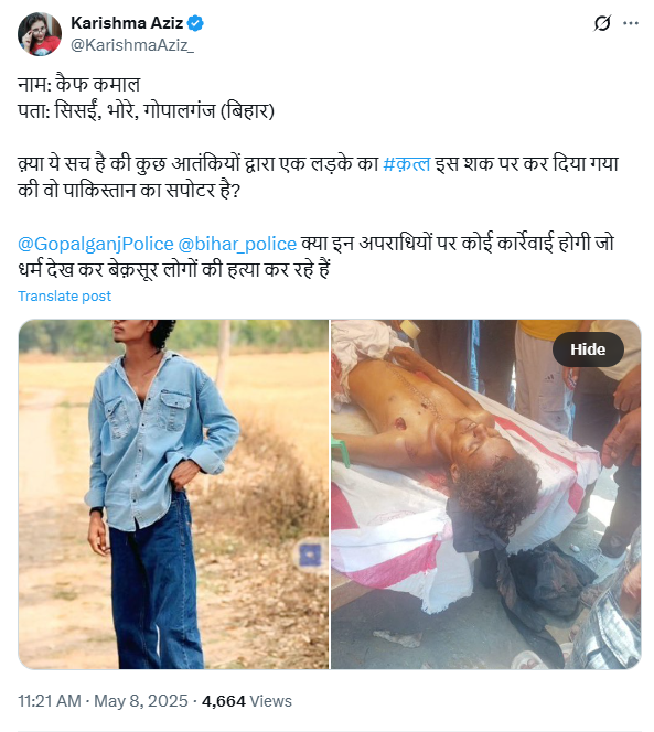 करिश्मा अजीज ने लिखा, ‘नाम: कैफ कमाल, पता: सिसईं, भोरे, गोपालगंज (बिहार) क़्या ये सच है की कुछ आतंकियों द्वारा एक लड़के का #क़त्ल इस शक पर कर दिया गया की वो पाकिस्तान का सपोटर है? @GopalganjPolice @bihar_police क्या इन अपराधियों पर कोई कार्रेवाई होगी जो धर्म देख कर बेक़सूर लोगों की हत्या कर रहे है’