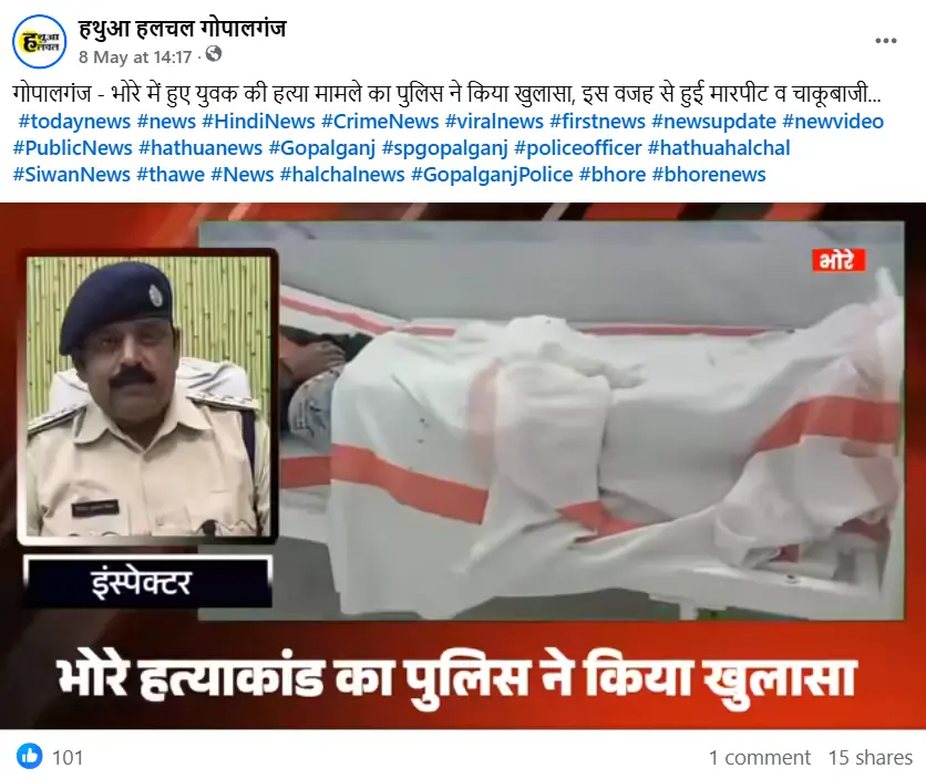 वहीं पड़ताल में आगे हमें ‘हथुआ हलचल गोपालगंज‘ नाम के एक फेसबुक पेज पर इस घटना पर पुलिस का एक बयान मिला। पुलिस ने इस घटना का खुलासा करते हुए बताया है कि दोनों पक्षों के बीच आर्केस्ट्रा वगैरह को लेकर पुराना विवाद था। कल आरोपी आशीष यादव व उसके साथी कैफ से बाजार में मिले। इस दौरान दोनों पक्षों में वाद-विवाद हुआ और आरोपियों ने कैफ को चाक़ू मार दिया। जिसके बाद अस्पताल ले जाते समय कैफ की मौत हो गई। इस मामले में तीनों आरोपियों को गिरफ्तार कर लिया गया है।