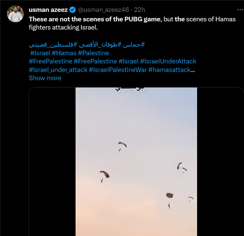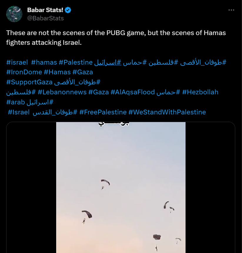 वहीं अवद फैज़ा ने लिखा “ये PUBG गेम के सीन नहीं हैं, बल्कि हमास के लड़ाकों के इजराइल पर हमले का सीन हैं।”