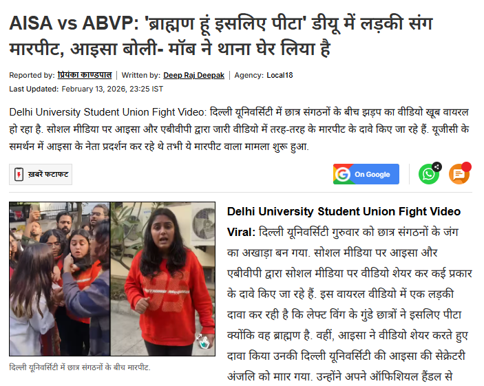 वहीं न्यूज़ 18 की रिपोर्ट के मुताबिक पत्रकार रूचि तिवारी के साथ मारपीट की घटना दिल्ली यूनिवर्सिटी में हुई थी। छात्र संगठनों के बीच मारपीट का मामला तब शुरू हुआ, जब लेफ्ट विंग के विरोध प्रदर्शन में ब्राह्मणवाद के खिलाफ नारे लग रहे थे। इस प्रदर्शन में ब्राह्मणों के खिलाफ बहुत बुरा-बुरा बोलने का आरोप लगाया गया है। बताया जा रहा है कि सामने खड़ी रुचि तिवारी ने इसका विरोध किया तो लेफ्ट के छात्र उसे पीटने लगे।
