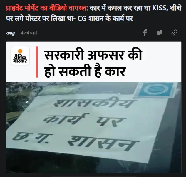 | निष्कर्ष | छत्तीसगढ़ में सरकारी कार में अश्लील कार्य करने का वायरल वीडियो साल 2021 का है। तब छत्तीसगढ़ में भाजपा नहीं, कांग्रेस की सरकार थी। |